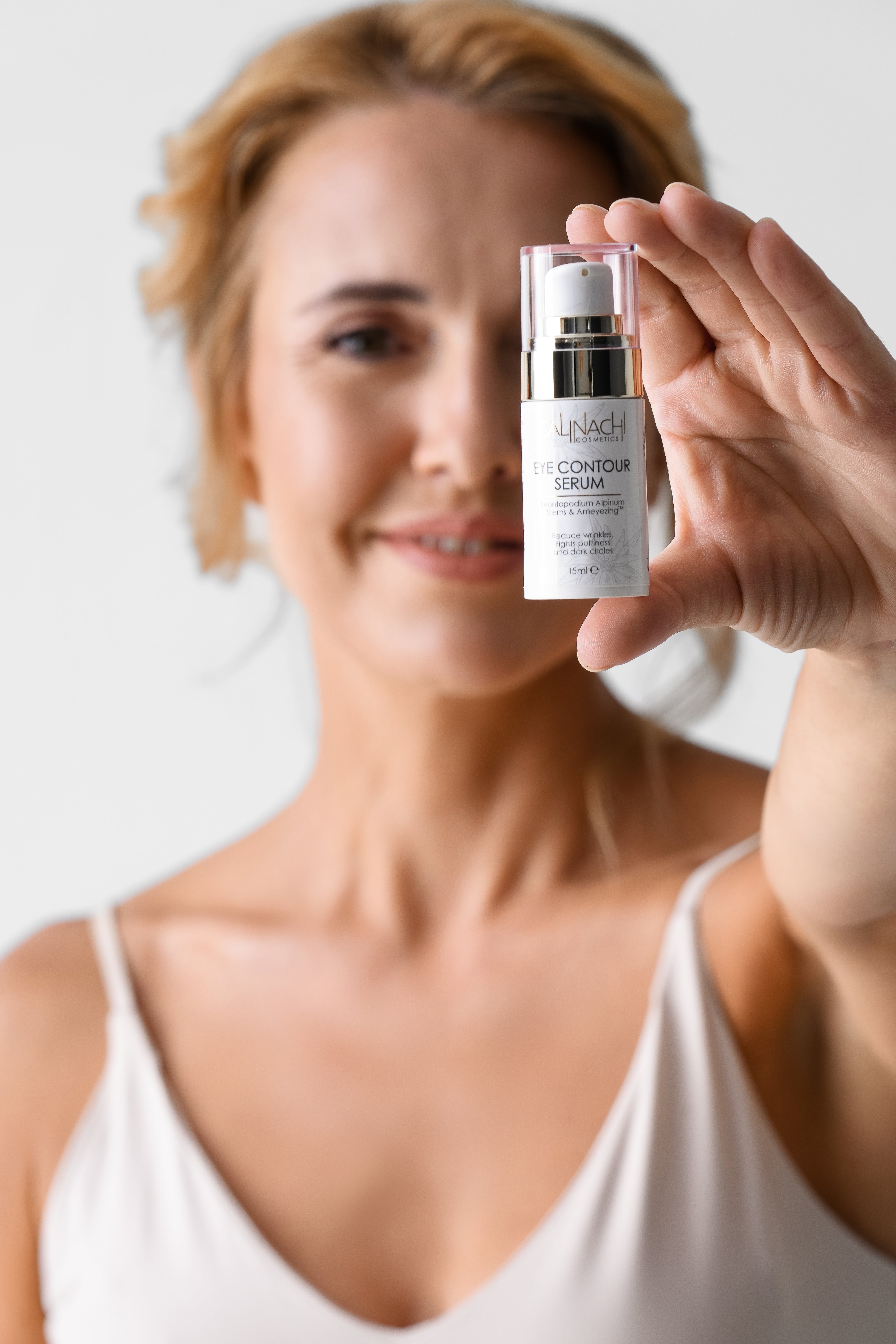 A Calinachi Szemkontúr Szérum látható ragyogást, mély hidratálást és ránccsökkentést nyújt egy könnyű formulában. A Sens’Hyal™, Ameyezing™ és Leontopod Stems GX™ erejével célzottan kezeli a sötét karikákat, duzzanatot és finom vonalakat a megújult, kipihent megjelenésért.