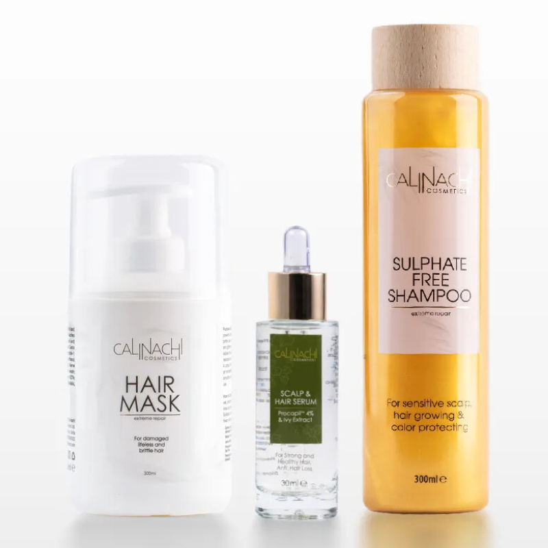 A CALINACHI Full Hair & Scalp Recovery Therapy egy teljes, 3 lépéses rendszer, amely a hajhullás elleni küzdelemre, a fejbőr egyensúlyának helyreállítására, valamint a haj természetes erejének és vitalitásának újjáélesztésére lett kifejlesztve. Ötvözi a Herbal Shampoo for Dry & Exhausted Hair mélytisztító és hidratáló hatását, a Protein Expert Hair Mask for Normal to Oily Hair regeneráló és kiegyensúlyozó erejét, valamint az Anti-Hair-Loss Serum célzott hajtüsző-stimuláló hatását. Együtt tudomány és természet által alátámasztott, látható eredményeket nyújtanak.